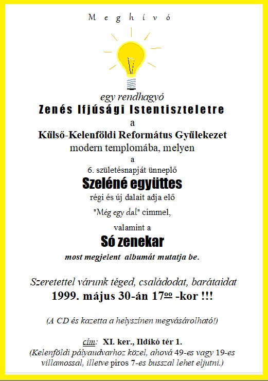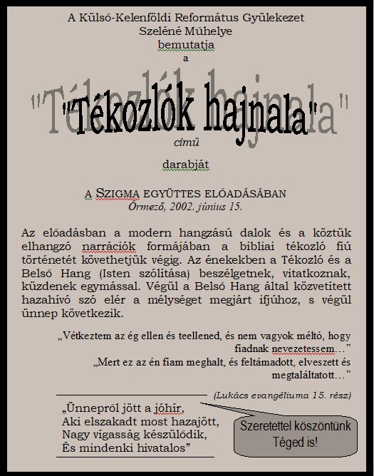 A Szeléné zenekar megszűnése után alakult a rövidéletű Szigma együttes (Kerekes Zsófia, Horváth Ildikó, Molnár Eszter, Kunfalvi István, Bucsy Kristóf, Sóskuti Zoltán). Először ez a csapat adta elő a "Tékozlók hajnala" című rockoratóriumot, ami a Tékozló fiú bibliai történetét dolgozza fel. (Az itt látható kis hirdetmény az őrmezei előadására hívja a nézőket. Itt szerepel először a "Szeléné Műhely" elnevezés!)